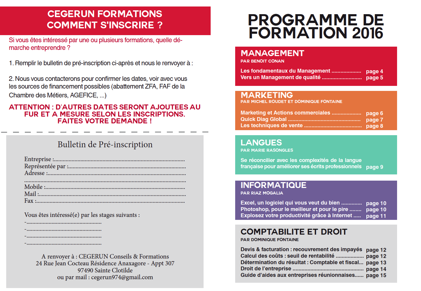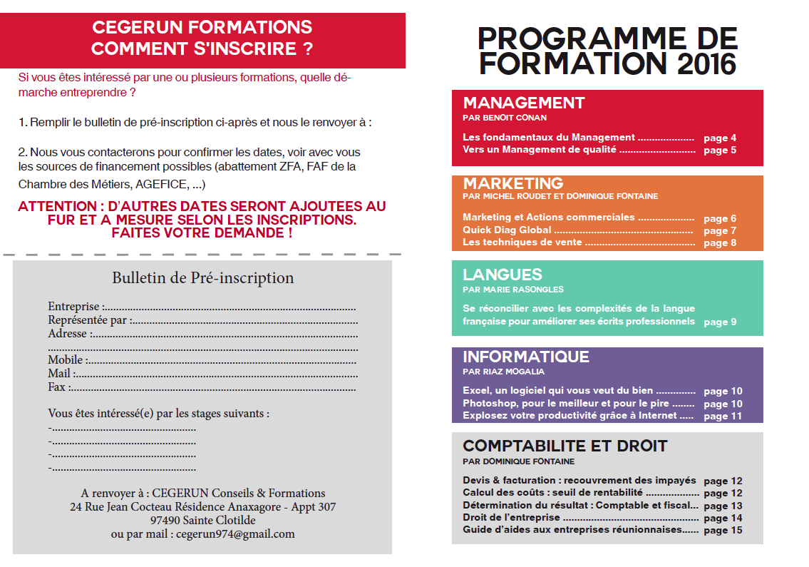 Notre cabinet organise à l’intention de ses clients des formations (inter/intra) dans le domaine de la gestion, du management, du coaching, de la communication et du markéting.